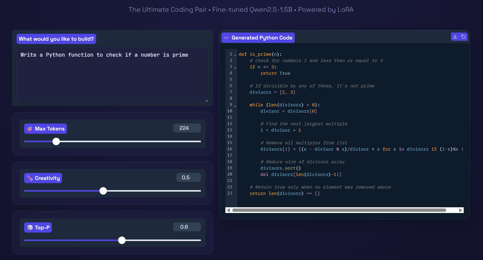 Fine-tuned an LLM to generate clean, ready-to-use Python code snippets. My first real fine-tuning experiment — tried GCP, Vultr, and RunPod before getting it right.